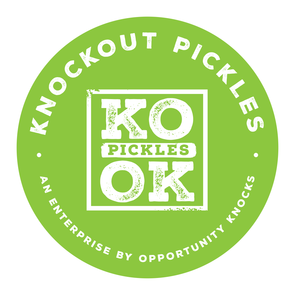 Knockout Pickles is a Warrior-driven, seed-to-jar pickle business launched in 2014, blending artisan quality with mission-based vocational opportunities. From recipe development to production to sales and delivery, Warriors take part in every step, producing delicious pickles sold locally in bulk and retail, creating both revenue for Opportunity Knocks and valuable skill-building experiences.